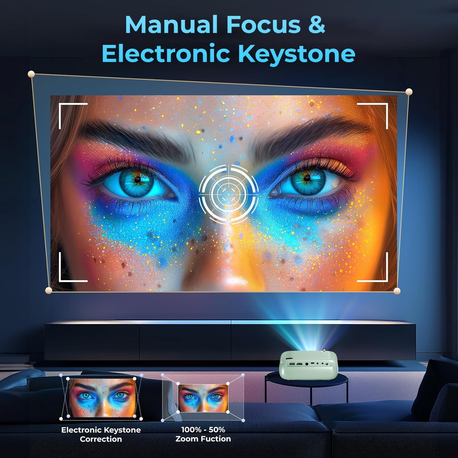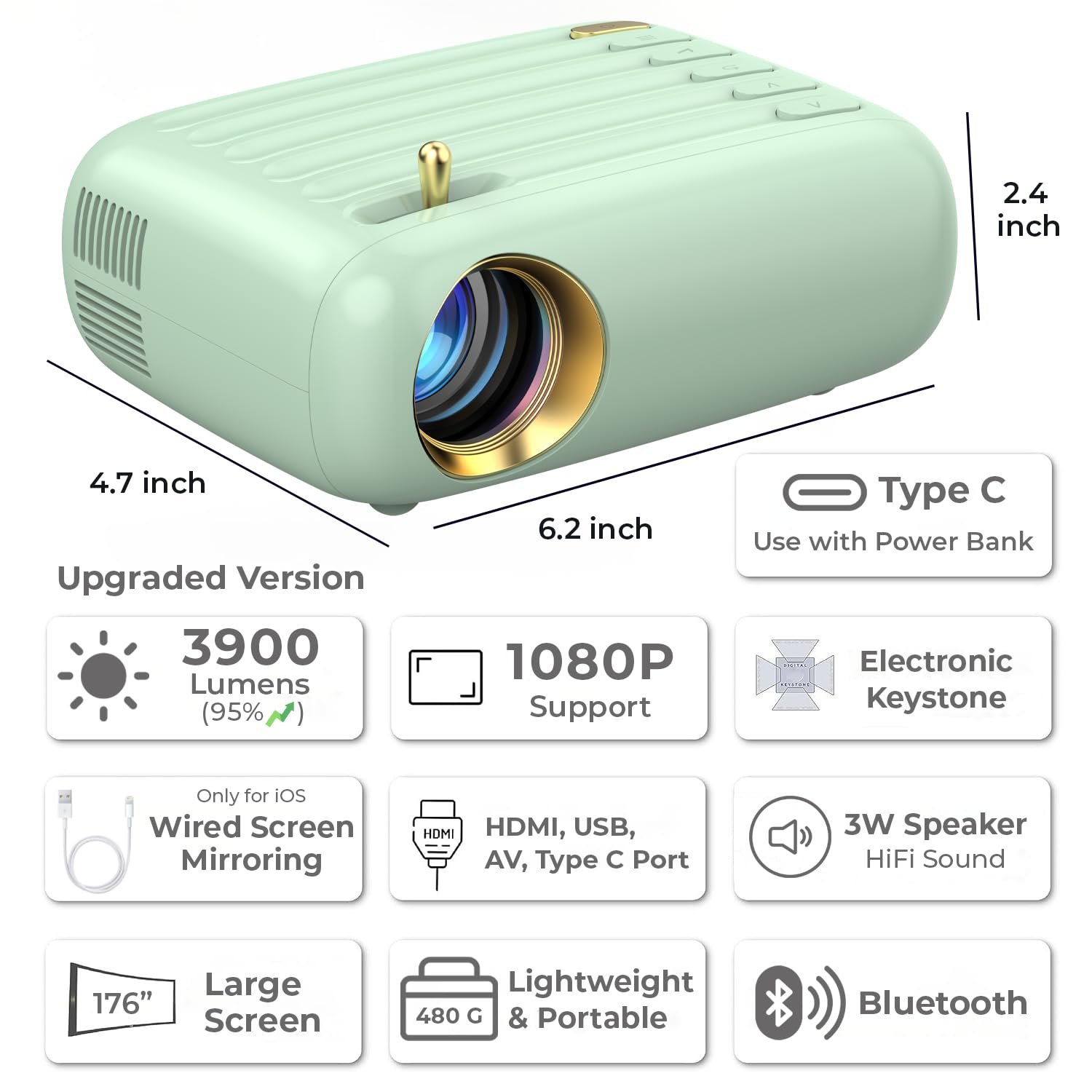 【Special features】: Dedicated focus knob (For precise focus adjustment) | Electronic Keystone, Small form factor measuring 6.2″X4.7″X2.9″ and 480 grams light weight | Dedicated navigation and control buttons on the body | Digital Zoom In & Zoom Out | Rear & Front Projection | Mstar Advance image processing engine | Efficient Cooling System | Bluetooth