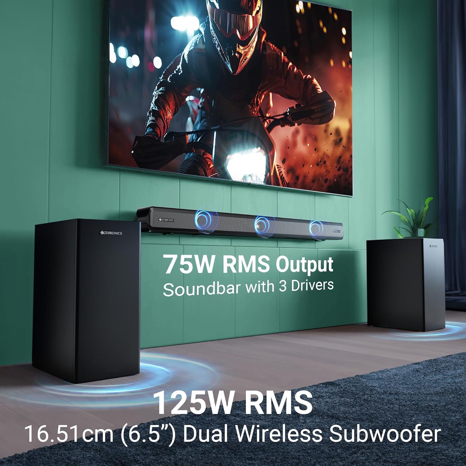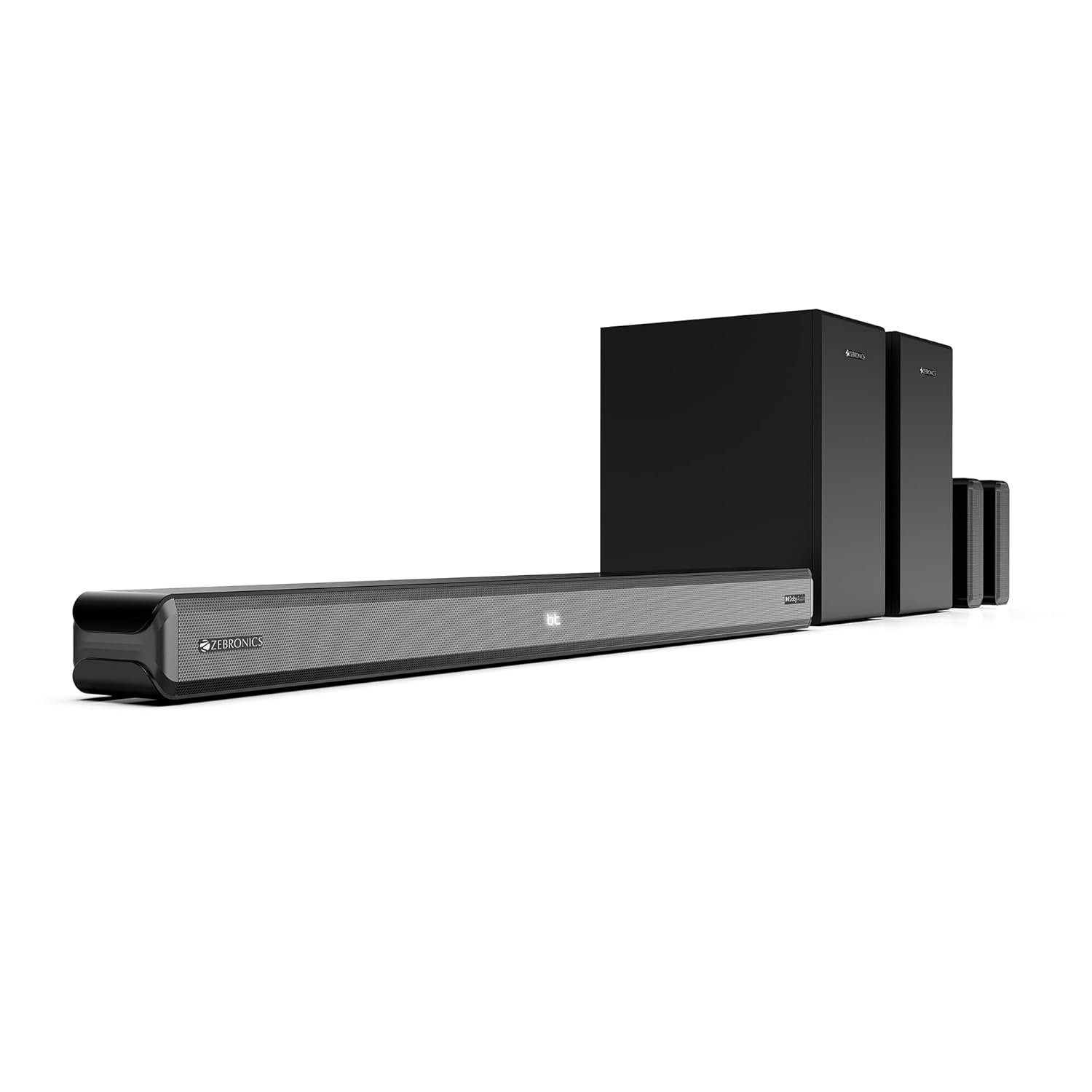 Power distribution: Supreme-quality sound and top-notch acoustics are because of the Zeb-Juke bar 9551 soundbar’s 625W power distributed as 75W from each of the triple drivers, 75W output from each of the dual wireless rear satellites, and 125W output from each of the dual wireless subwoofers.